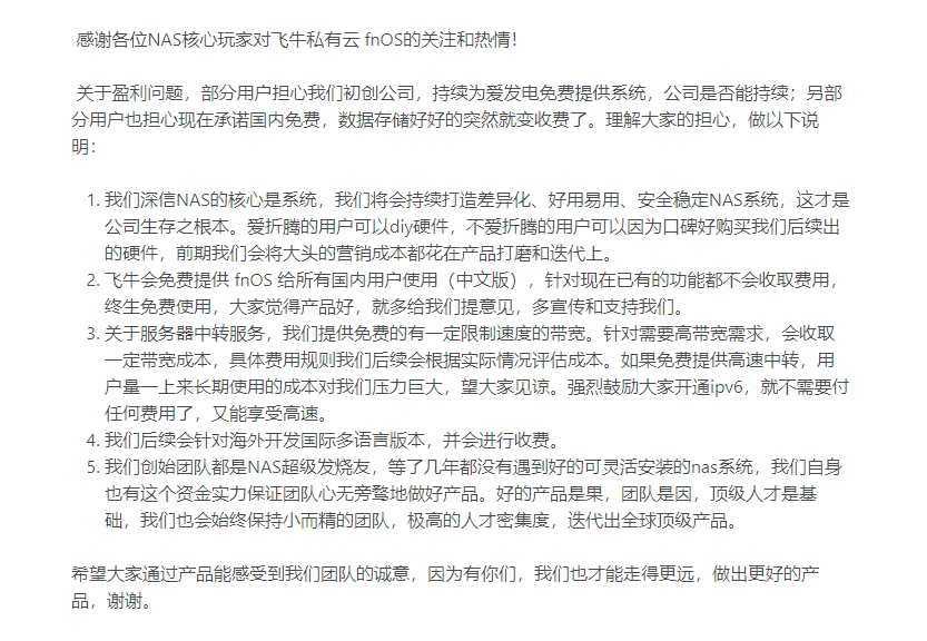 关于飞牛私有云 fnOS 系统后续盈利说明