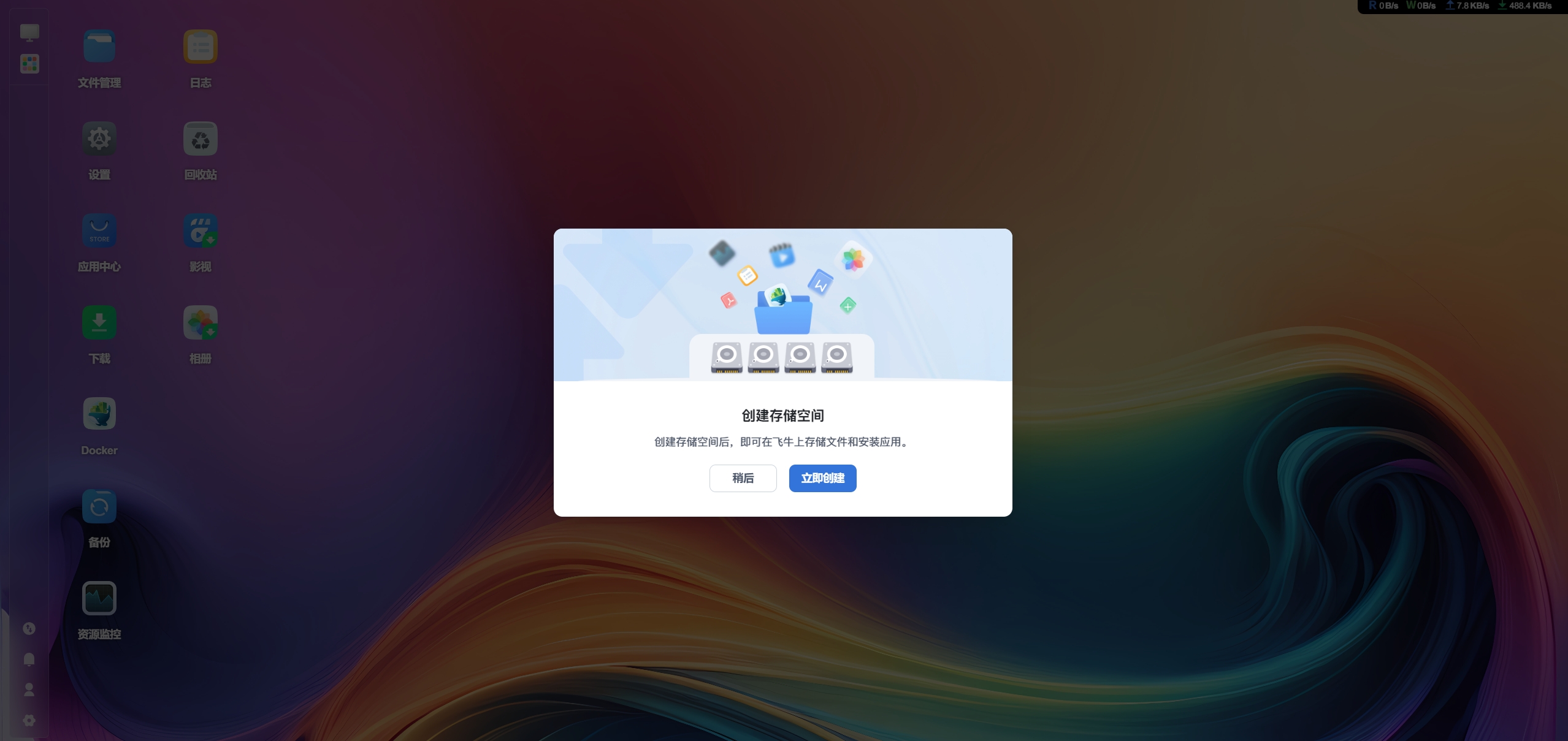 建议尽快创建存储空间以便上传文件和安装应用。如果硬盘还没有准备好,也可以点击 稍后 跳过,后续可从 设置 > 存储空间管理 中创建。